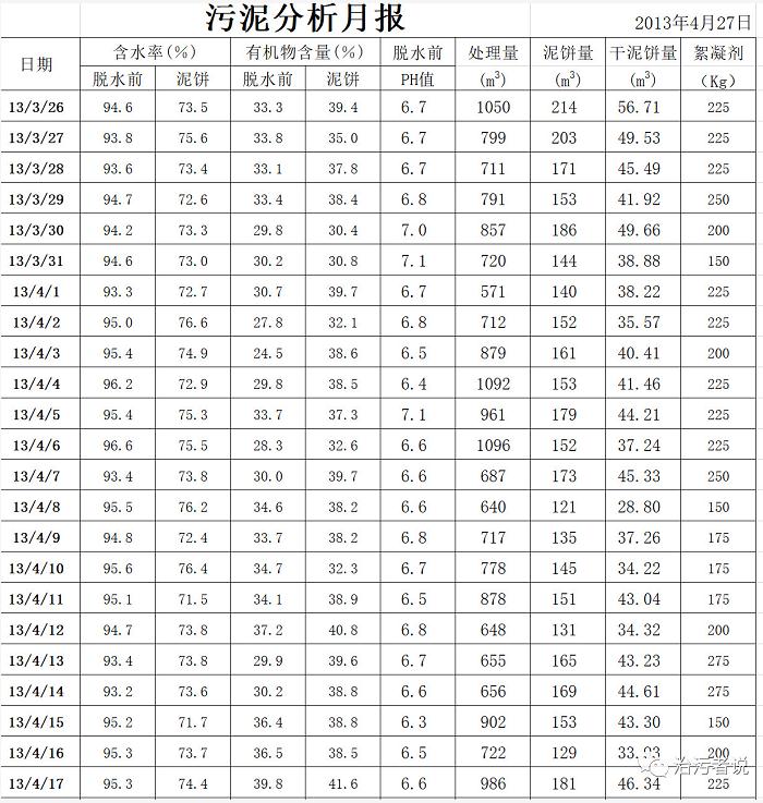 我們今天需要進(jìn)行討論的是關(guān)于污泥車間的運(yùn)行統(tǒng)計,污泥車間作為污水廠污泥處置的主要生產(chǎn)車間,需要和污水車間配合進(jìn)行整體的生產(chǎn)運(yùn)行,污泥車間根據(jù)污泥脫水原理,需要在生產(chǎn)過程中添加高分子絮凝劑PAM,有些還要添加一些無機(jī)的化學(xué)調(diào)理劑,這是污泥車間的成本的主要支出項目;污泥車間每日的進(jìn)泥量,每日脫水后的泥餅量,是污泥車間的主要的生產(chǎn)指標(biāo);每日脫水前后含水率的變化,是污泥車間脫水的效能指標(biāo)。這些指標(biāo)綜合反映了污泥脫水生產(chǎn)的各個環(huán)節(jié),在污泥車間日常生產(chǎn)中需要對這些指標(biāo)內(nèi)容進(jìn)行詳細(xì)的生產(chǎn)統(tǒng)計。