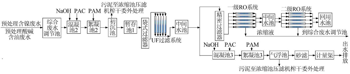 (2)在去除陽極氧化廢水中重金屬鎳的過程中,要加強對廢水預處理時pH的準確控制,使鎳在進入后續的RO等系統之前能實現較高的去除率,如此才能穩定確保回用水及排放出水中鎳的質量濃度在0.5 mg/L以下。
