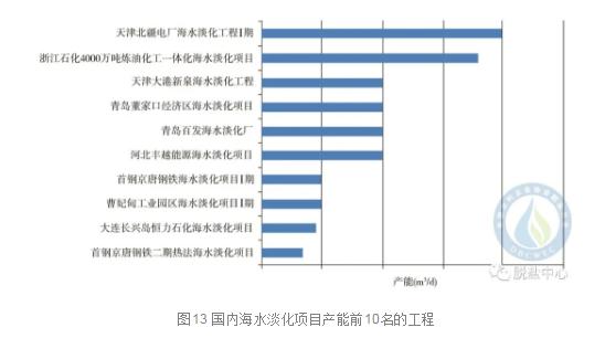 國內(nèi)已建成的海水淡化工程排名前十位的工程均為日產(chǎn)能萬噸級以上(圖13),十萬噸(含)以上的海水淡化工程有6個。其中天津北疆電廠海水淡化工程(Ⅰ期)的規(guī)模最大,為20萬立方米/日。